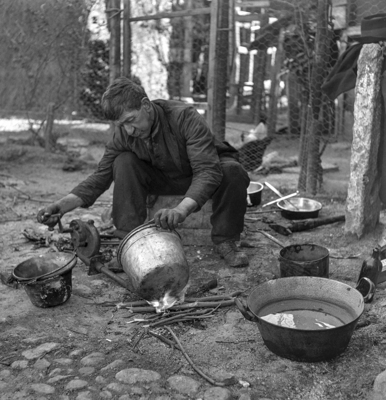 Als man schadhafte Gegenstände noch reparierte und nicht wegwarf: Kesselflicker gingen vor allem in ländlichen Gebieten von Tür zu Tür und sammelten schadhafte Pfannen und Kessel ein. Einige der Pfannenflicker betätigten sich auch als Scherenschleifer oder Besenbinder. Das Bild zeigt einen Kesselflicker zu Beginn des Zweiten Weltkriegs im Tessin.