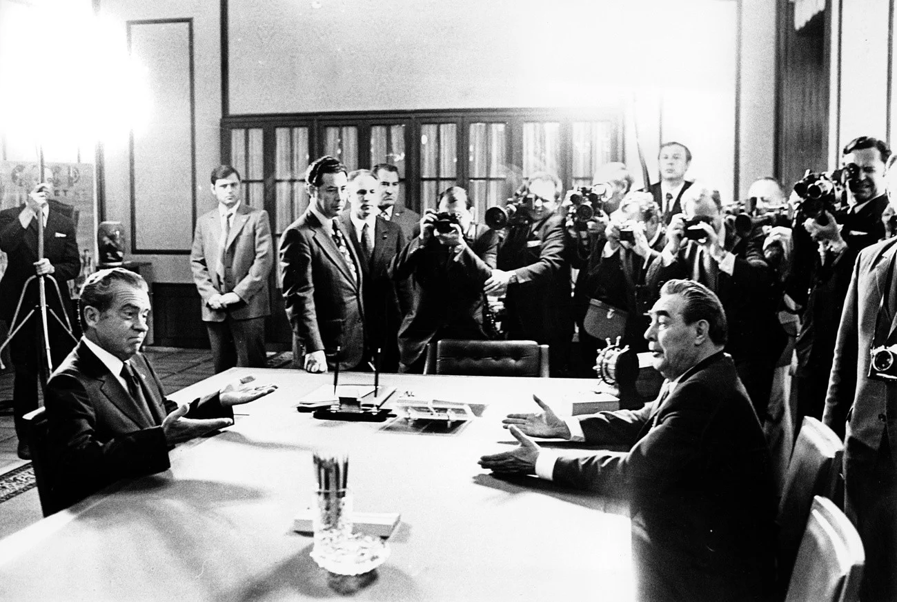 Richard Nixon und Leonid Breschnew verhandeln im Juni 1974 in Moskau über Abrüstung. Zwar fürchtete der Westen russische Expansionsgelüste, aber Richard Nixon konnte trotzdem Schritte zur Rüstungskontrolle vorschlagen. Es liegt eine Paradoxie darin, dass zwei hochgerüstete Blöcke eine Stabilität schaffen konnten, die Spielräume eröffnete, wie sie heute kaum noch vorstellbar sind.