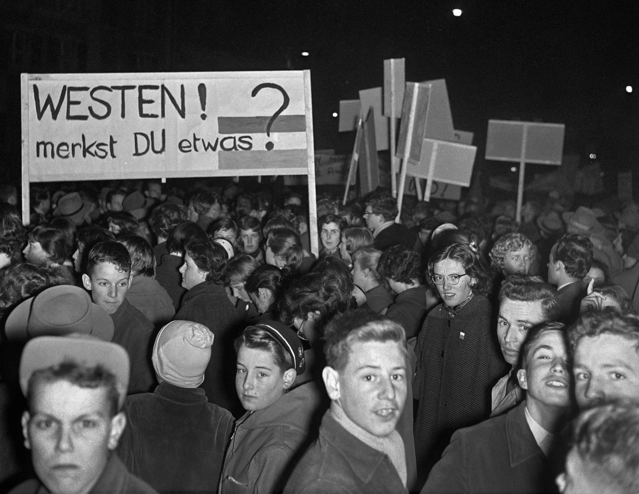 «Use mit de Russe»: Nein, das Bild stammt nicht von einer Solidaritätsdemonstration mit der Ukraine. Die Aufnahme ist fast 70 Jahre alt. Am 5. November 1956 demonstrierten auf dem Berner Waisenhausplatz Tausende Menschen gegen den sowjetischen Einmarsch in Ungarn.