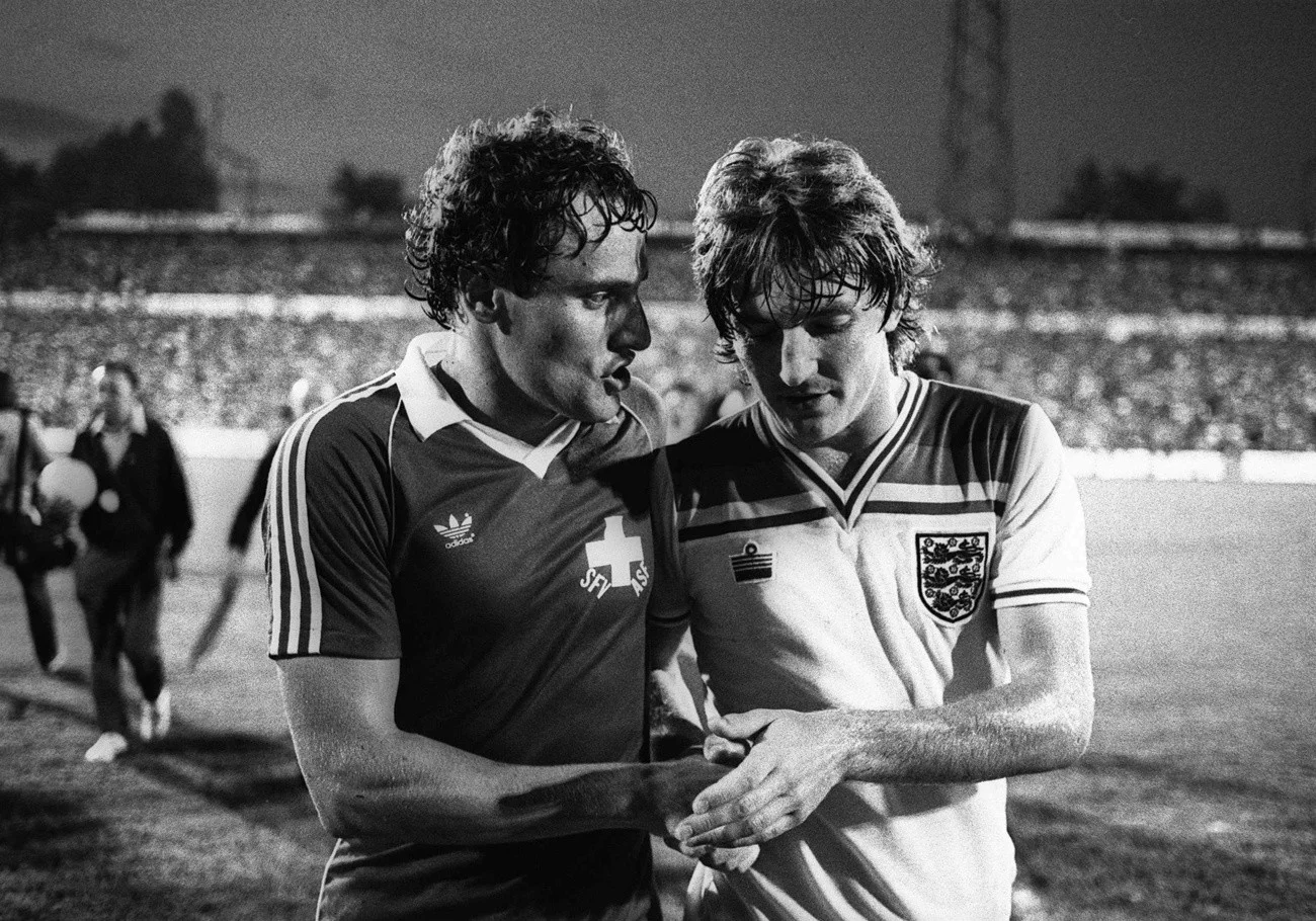 24 Mal spielte die Schweiz gegen England. Nur zwei Mal gewannen die Eidgenossen. Der letzte Sieg liegt 43 Jahre zurück. Damals, am 30. Mai 1981, bezwangen die Schweizer in einem WM-Qualifikationsspiel im St. Jakob-Stadion in Basel die Engländer mit 2:1. Nach dem Spiel umarmt der Schweizer Trainer Paul Wolfisberg den Verteidiger Gianpietro Zappa.